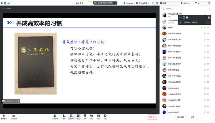 本次讲座的成功开展,使同学们明确了自身奋斗目标,坚定了拼搏努力的信念,坚持充分利用在校时间进行自我提升,让青春在奋斗和拼搏中绽放,为后面的科研生活打下了坚实的思想基础。