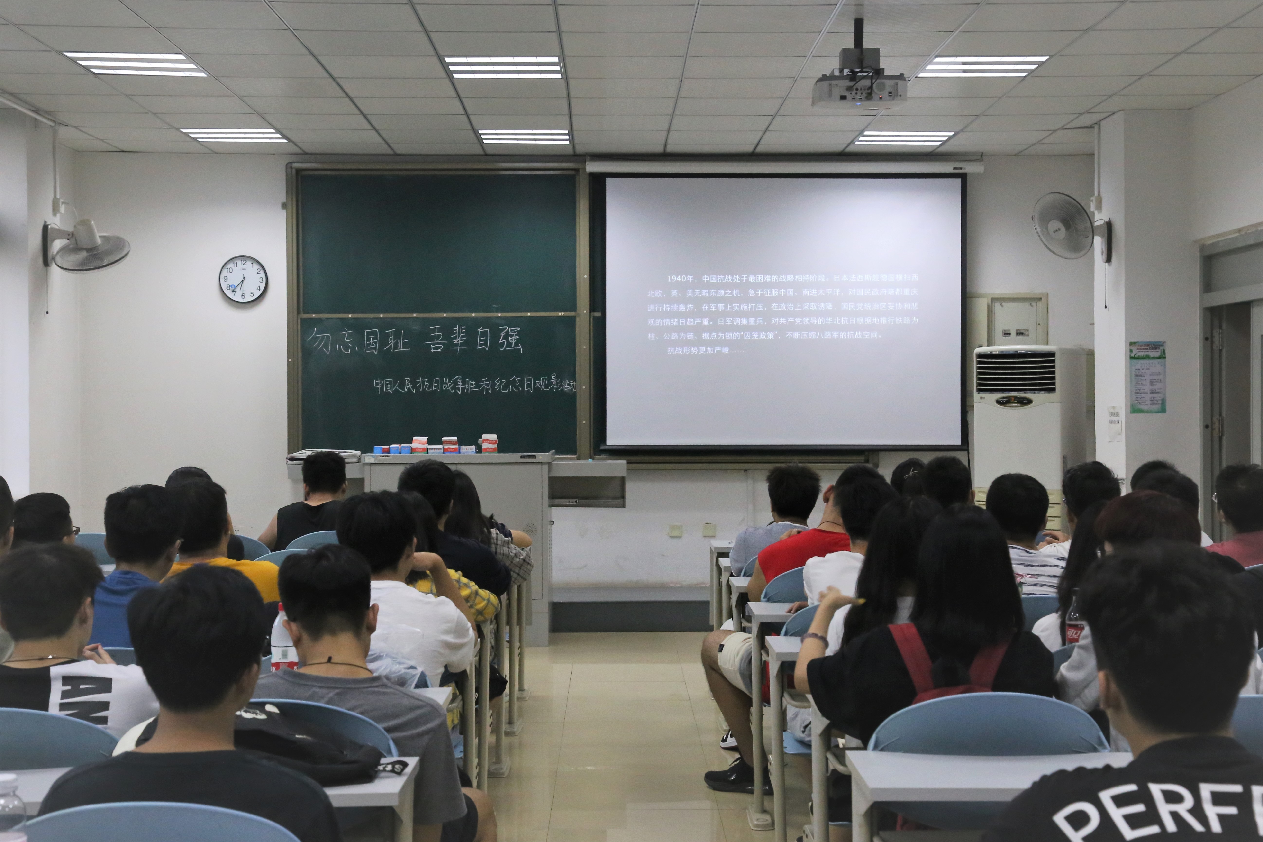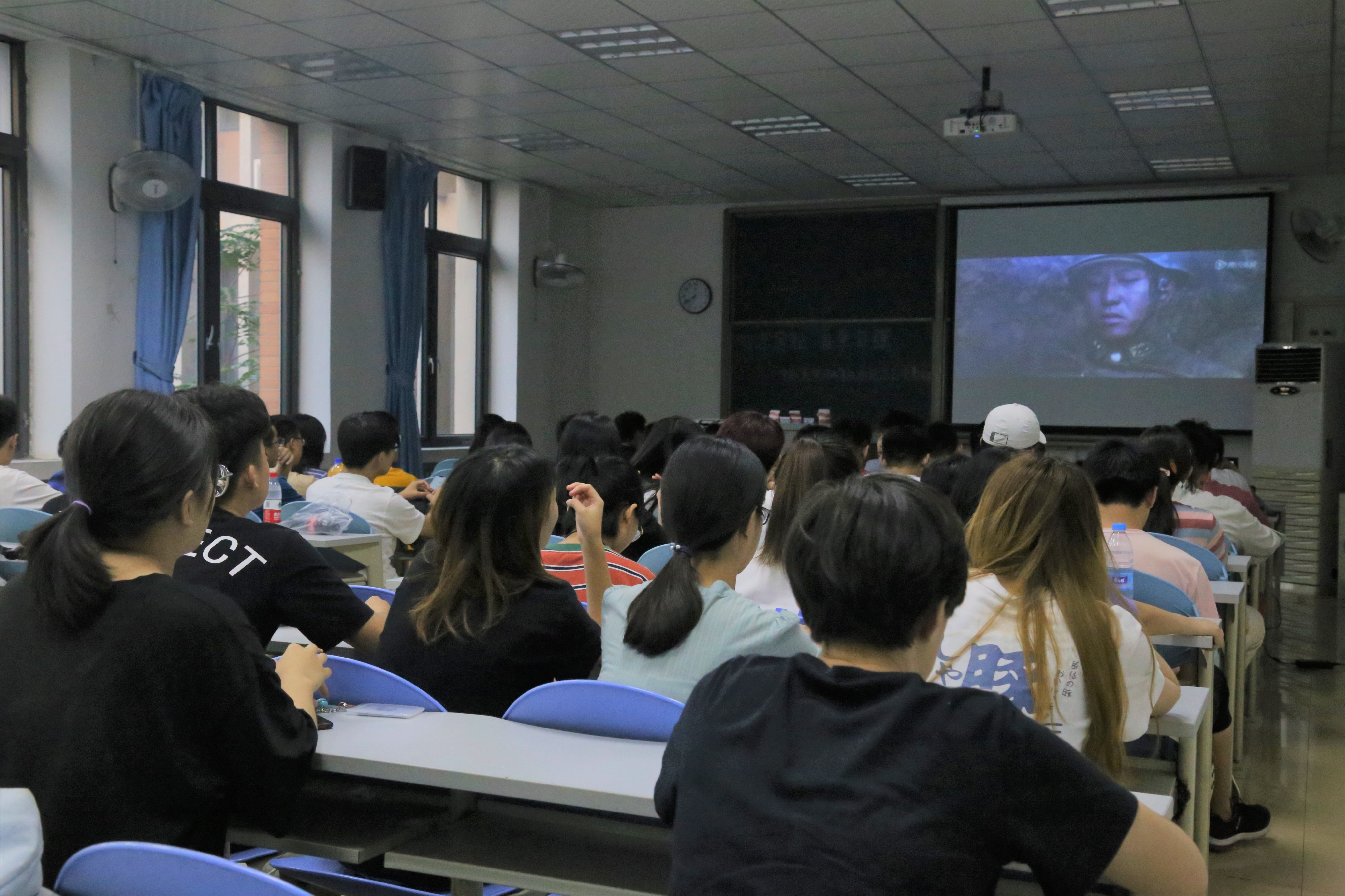为纪念中国人民抗日战争胜利74周年,深入贯彻学习习近平新时代中国特色社会主义思想,弘扬以爱国主义为核心的伟大民族精神,人工智能学院2017、2018级学生代表9月3日于泰达校区西院12-209教室观看电影《百团大战》,共同缅怀先烈。