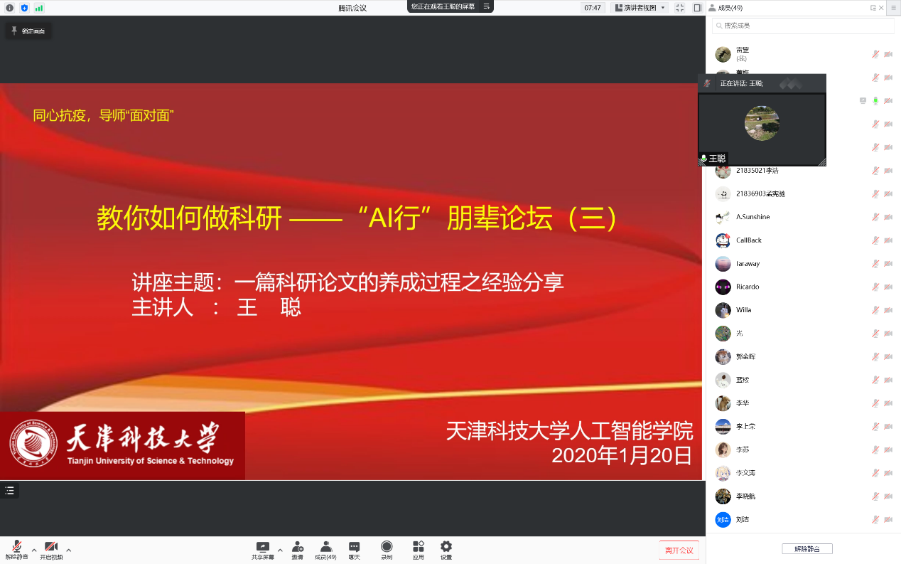 2022年1月20日上午10点,为拓展研究生的学术视野,激发研究生的创作热情,人工智能学院在腾讯会议平台开展“AI战疫行”主题活动之“AI行”朋辈论坛学术云沙龙系列活动第三场,本次活动邀请到天津科技大学物联网与信息安全创新团队成员王聪老师进行有关科研论文养成经验的分享,人工智能学院副院长张贤坤、研究生辅导员宋绍玮出席活动,学院研究生、本科生百余人参会。