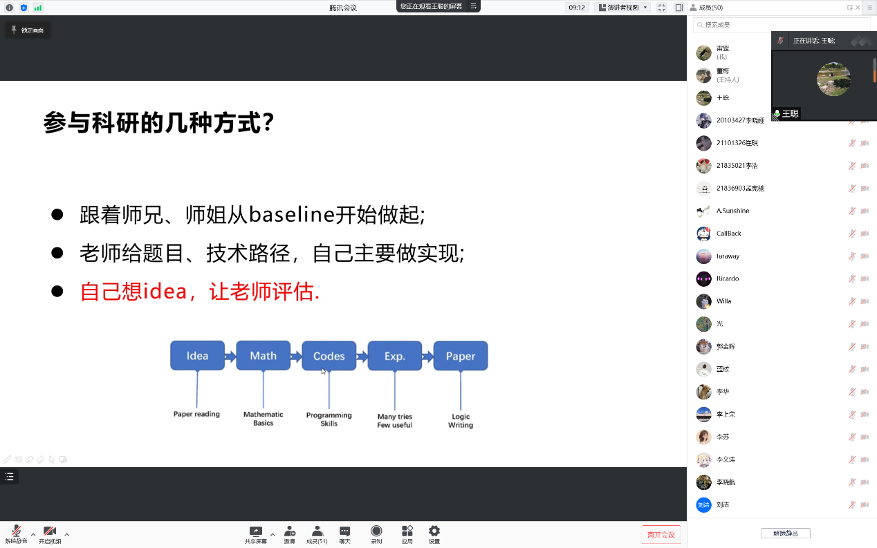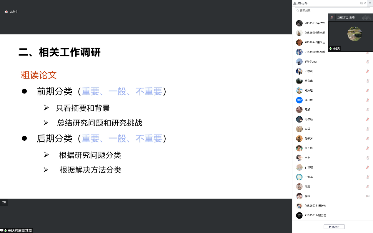 会议伊始,王聪老师询问大家参与科研的方式从而引出论文写作第一个版块——如何选题。王聪老师建议大家优先选择自己感兴趣的课题,选择相对热门、新的课题。通过下载相关论文、粗读论文、精读论文,并总结现有算法的优缺点来得到效率更高或安全性更高的创新点。