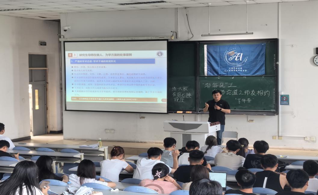 为进一步加强学风建设、增强科研素养,营造良好科研氛围,充分发挥研究生导师的教书育人作用,5月22日中午12:30,本次“下午茶”活动邀请到人工智能学院院长、硕士生导师张贤坤于滨海西校区8号楼6阶教室为大家带来了题为“传道授业解惑:厚而博学,和而不同”的宣讲。