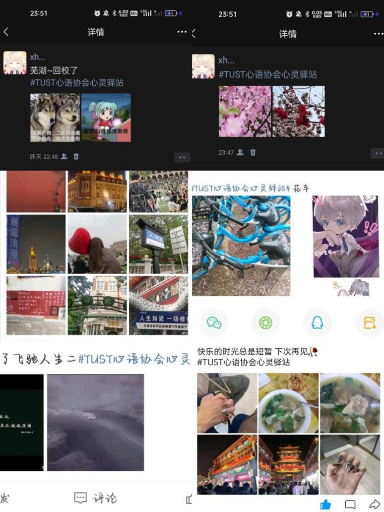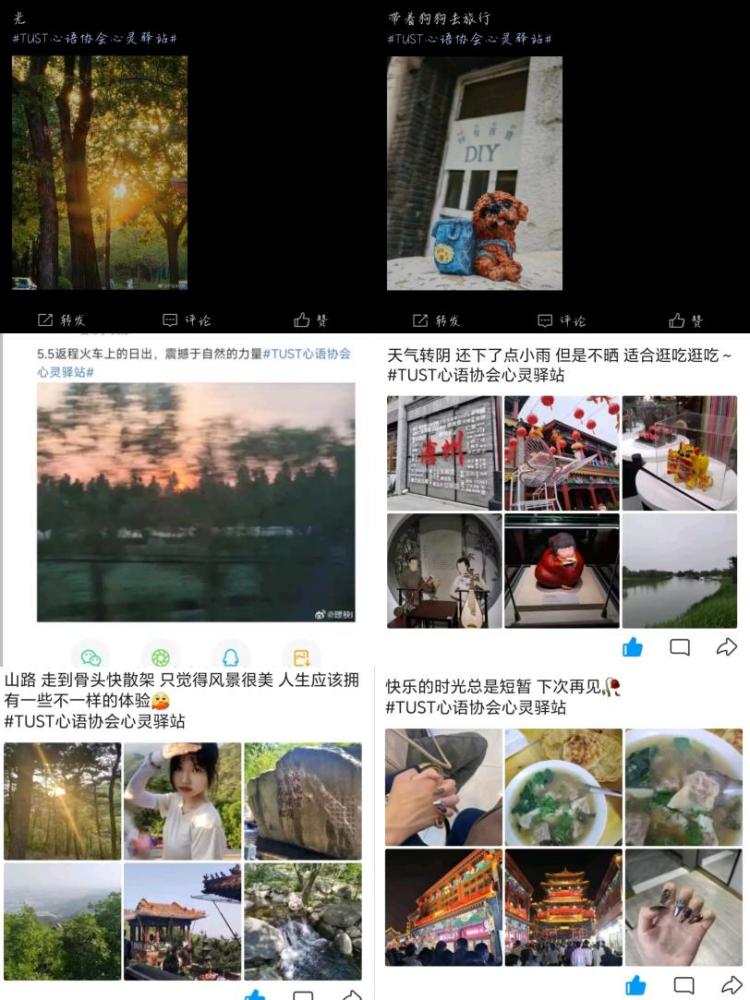 活动自启动以来,得到了广大同学们的积极响应和热情参与。同学们利用五一假期,或阅读书籍、或与家人朋友共度美好时光、或走进大自然感受自然的魅力。活动期间,同学们积极参与线上分享,展示了自己在假期中的所见所闻、所感所想。社团对同学们的分享进行了认真阅读和整理,精选出了一批具有代表性的分享内容,并通过线上平台进行了展示。这些精选的分享不仅引起了同学们的共鸣,也激发了他们对内心世界的更多思考。通过本次“心灵驿站”线上分享活动,同学们不仅增进了彼此之间的心理理解与支持,也更加深入地认识了自己的成长方向。同时,活动也促进了学院内部的凝聚力,为营造积极向上的校园文化氛围做出了贡献。