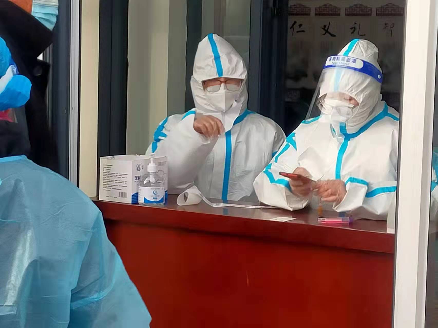 1月10日早上五点,敬青松已经从家里赶到张牛屯村的志愿服务中心,准备开始一天的辛苦工作。他参加了家乡全员核酸检测志愿服务,其岗位负责核酸检测点的稳定秩序和帮助老年人进行登记。志愿者们穿上防护服,戴好护目镜,做全防护准备工作后,正式开始了保卫人民、抗击疫情的战斗。