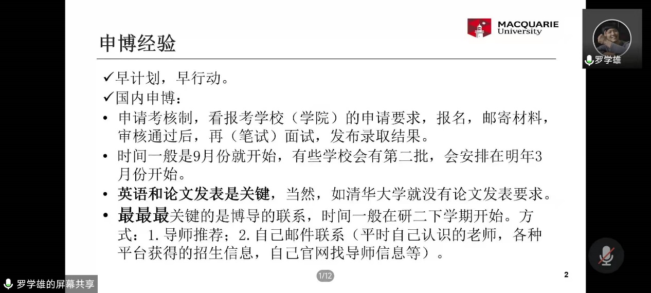 尚静同学与罗学雄同学从申博读博的目的、博士申请类型、资料收集、联系导师等方面介绍了自己申博读博的经历。在申请读博目的方面,尚静强调选择读博需要对计算机技术有热爱,如果没有太多的兴趣不建议申请读博。在博士类型方面,她介绍了博士申请类型分为直博、硕转博、普博,并对三种类型进行简要介绍。在资料收集上,她介绍了国内读博与国外读博资料的收集方式、申请方式、考试方式,并结合自己的经历做了细致的介绍。罗学雄强调申博读博一定要早计划,早行动。考虑国外读博,他介绍了不同国家的博士生待遇、奖学金情况、语言要求、成绩要求等。然后,他分享了自己从研一到研三的科研经历并为同学们分享了文献查找、代码管理、论文写作、科研咨询、留学资讯相关的好用资源。