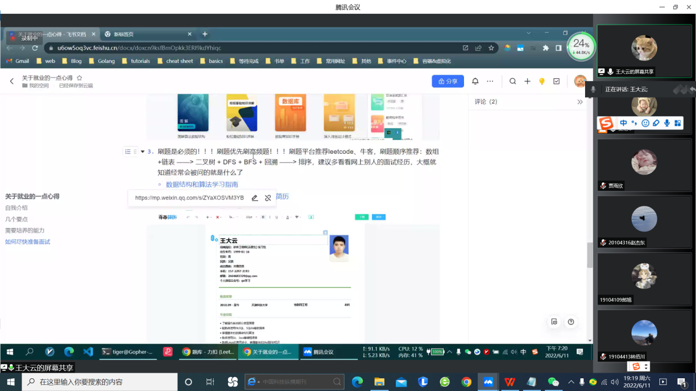 本次活动邀请了物联网工程2018级的孙世伟、赵梦飞、王大云、郭龙凯、周浩、高炜杰6位同学分享就业的经验。他们分享了前端、后端的学习经验,公司对前端、后端的技术需求;如何撰写简历、投简历、如何应对面试、每一轮面试的注意事项。也介绍了如何在考研和就业选择上的一些心得体会。