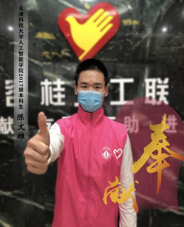 陈文雄,中共党员,网络工程专业2017级本科生,现任院新媒体中心副主席和班级文体委员。他是一名退伍大学生,退伍不褪色。作为一名军人,曾服役于北京消防,在部队拼搏进取,考取消防员五级证书和初级急救员证,两次任命火场文书班长,获个人嘉奖一次;作为一名学生党员,曾获国家奖学金、校一等奖学金等,他紧密联系低年级团员青年,主动帮扶困难学生,2019年度团员评议优秀;作为国防协会一员,担任塘沽新兵役前集训和学校军训教官,参加天津市国防教育活动、滨海新区及三所高校征兵宣传活动等;作为一名志愿者,2019年至今参加全国特奥会、海南省义工支教等志愿服务达198小时。面对疫情,他主动请缨参加线下联防联控工作,为高速公路来往车辆进行登记并测量司乘体温,守护着一方百姓的平安,期间检查车辆1000余辆,司乘1500余人。